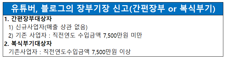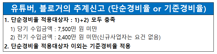 유튜브나 블로그로 인한 당기 수입금액이 7,500만 원 미만에 해당하고, 전기 수입금액이 2,400만원에 미달(신규사업자는 전기수입 요건 없음)한다면, 경비 증빙이 없더라도 추계(추정하여 계산)신고를 진행해도 무리가 없습니다. 이 경우,단순경비율을 적용받을 수 있어 경비를 상당 부분 인정받을 수 있어 세금 부담이 적습니다.