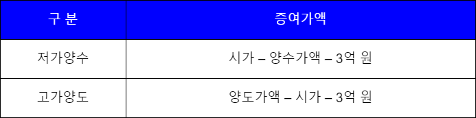 증여재산가액 : (9억 원 – 3억 원) - 3억 원 = 3억 원 |