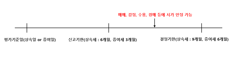또한, 상속세과세표준 신고기한부터 9개월, 증여세 과세표준 신고기한부터 6개월까지의 기간 중에 매매 등이 있는 경우에도 이를 시가에 포함시킬 수 있습니다. 이 기간 중에 매매 등이 있는 경우에는 해당 매매 등이 있는 날부터 6개월 이내에 매매 등의 가액의 입증자료를 첨부하여 평가심의워윈회에 신청을 해야 합니다.