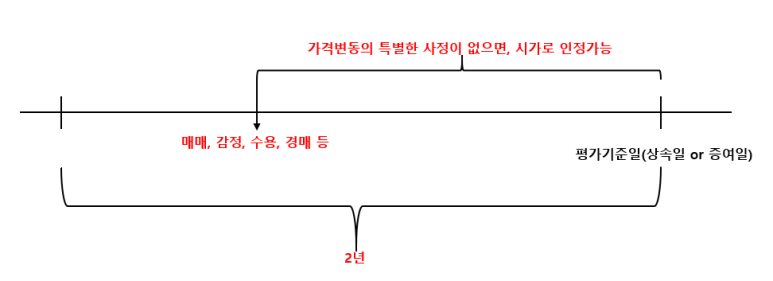 평가기간에 해당하지 않는 기간으로서 평가기준일 전 2년 이내의 기간 중에 매매, 감정, 수용, 경매 또는 공매가 있는 경우로서 평가기준일과 다음의 어느 하나에 해당하는 날까지의 기간 중에 가격변동의 특별한 사정이 없다고 인정되는 때에는 이를 시가로 인정할 수 있습니다.