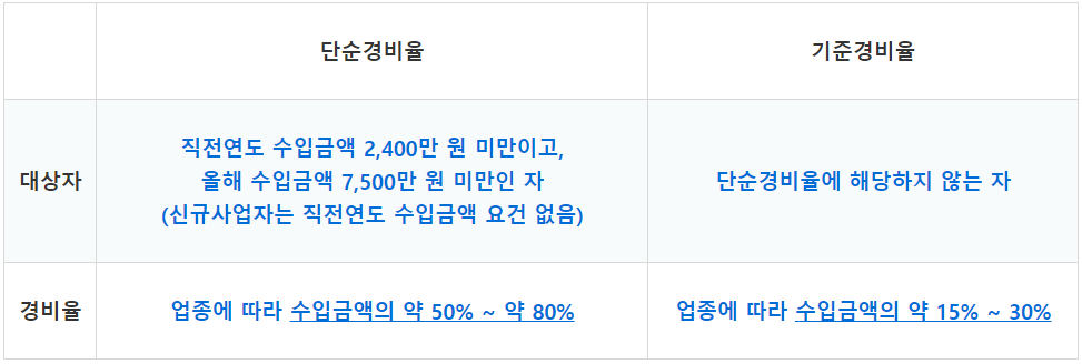 따라서 세법에서 업종에 따라 일정한 경비율을 정해줍니다. 경비율은 단순경비율과 기준경비율로 나뉘는데요. 프리랜서를 기준으로 단순경비율 대상자와 기준경비율 대상자는 다음 표와 같습니다.