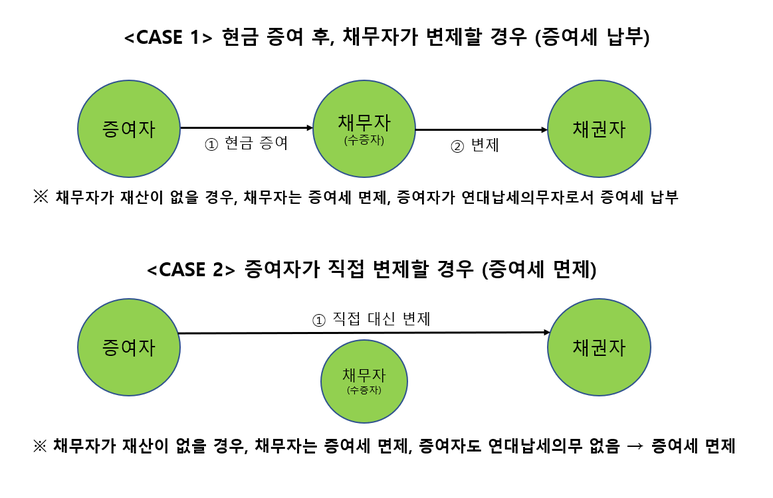 이럴 경우, 대부분 채무자는 재산이 없습니다. 따라서 국세청은 채무자에게 증여세를 부과하기 어려우므로 증여자에게 연대납세의무를 부여하여 증여자에게 증여세를 부과합니다.