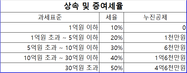 또한 증여세의 세율은 다음과 같은 누진세율 구조로 되어있습니다.