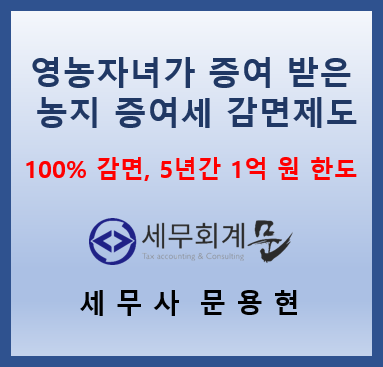 안녕하세요. <세무회계 文> 문용현 세무사입니다. 영농자녀가 증여받은 농지에 대한 증여세 감면 규정에 대해서 알아보겠습니다.